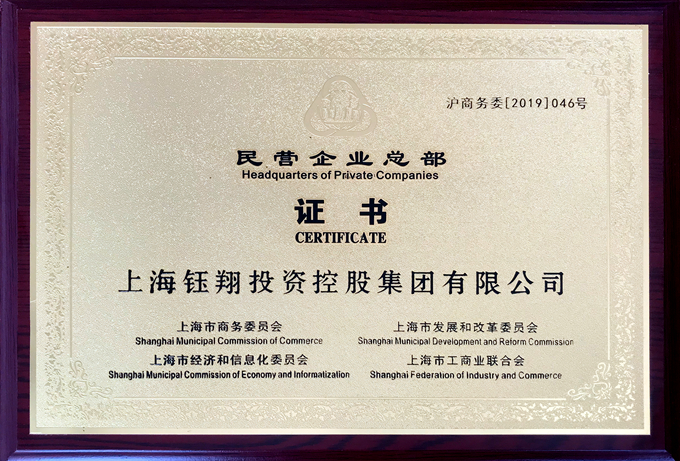 上海市商務委員會、上海市發展和改革委員會、上海市經濟和信息化委員會、上海市工商業聯合會等部門聯合認定集團為上海市民營企業總部,并已在近期向我集團頒發證書。